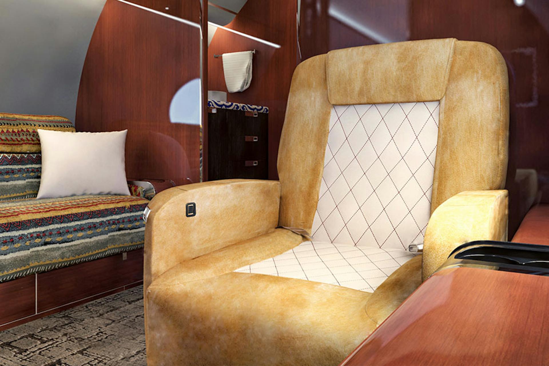 This jet interior reflects the essence of San Miguel with bold yet sophisticated colors, intricate craftsmanship details and a sense of cultural vibrancy. Its beauty and rich heritage create a warm and inspiring atmosphere, still infused with luxury and refinement.