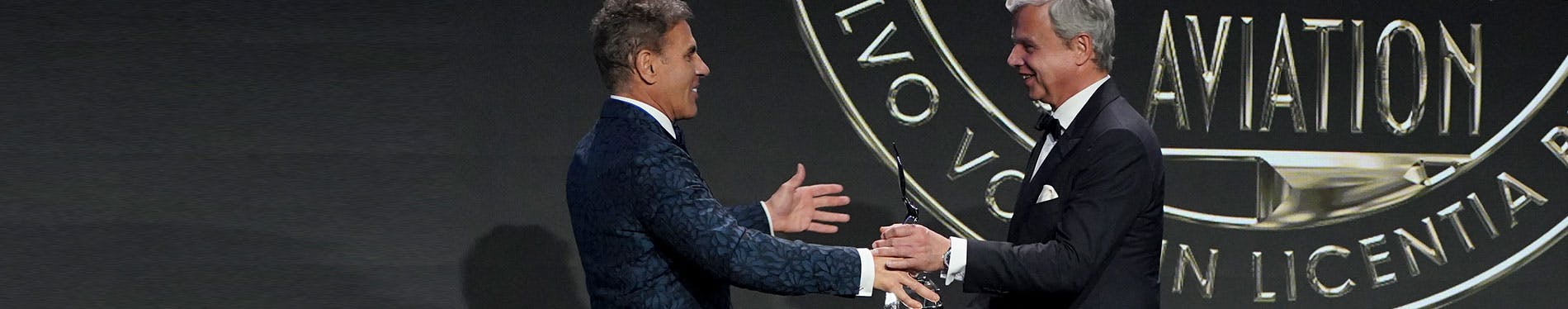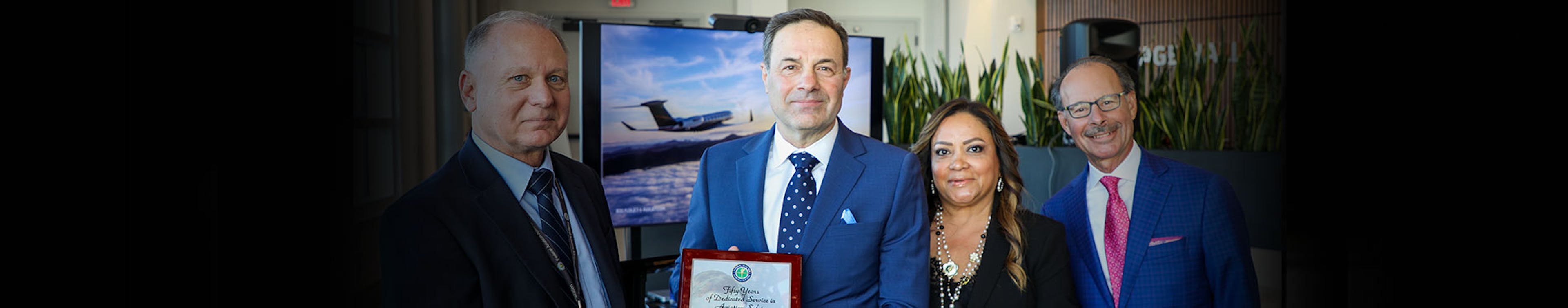 Kenn Ricci, founder and principal of Directional Aviation Capital and chairman of Flexjet, Inc., awarded George A. Antoniadis, founder, president and CEO of PlaneSense, Inc. with the Living Legends of Aviation Kenn Ricci Lifetime Aviation Entrepreneur Award.